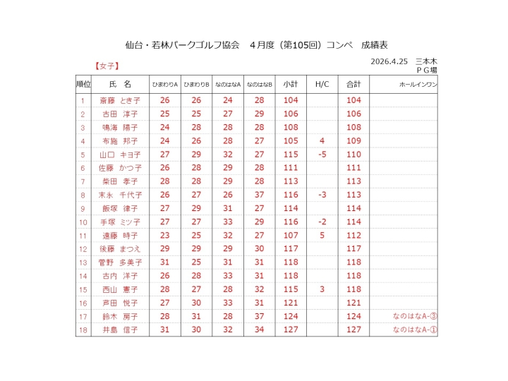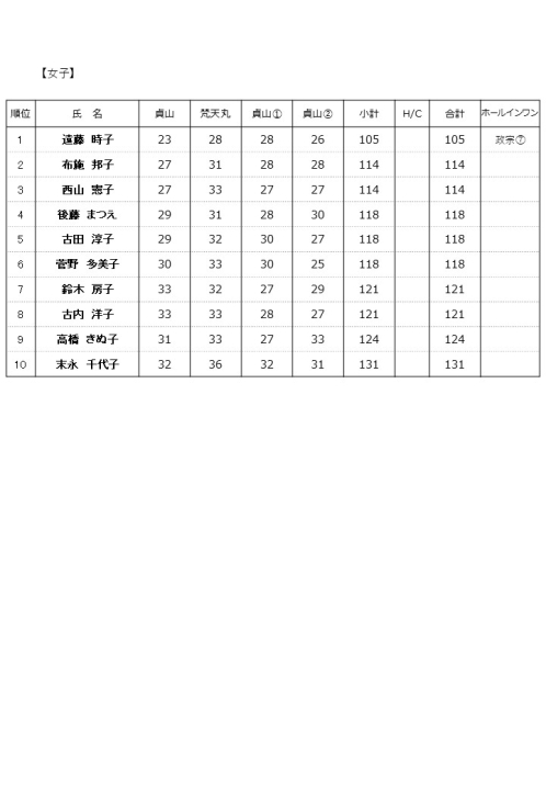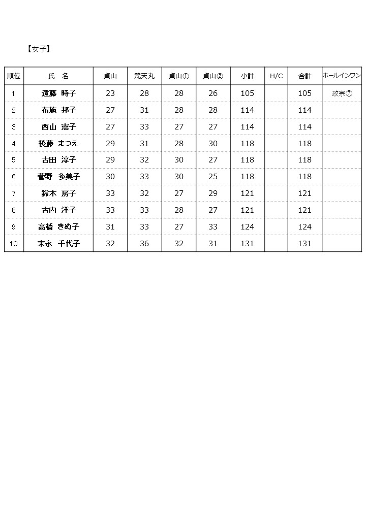 | 優勝 | 斎藤とき子 | 104 | ‐ | 104 |
